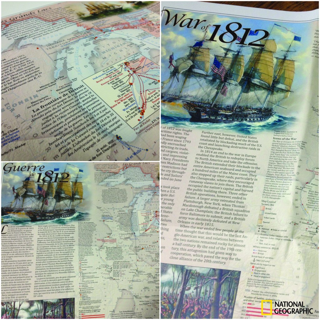 The War of 1812 map that depicts the numerous battles and troop movements involved in the War was made a few years back. Parks Canada wants to use it at one of their locations and current with Canadian law everything must be in both French and in English. Originally made in English we we’re in contact with a French Translator who helped translate much of the text elements. French, being much longer than English made for a challenge in finding room on this already large factual map. It was set to go out next week and was the second side project I was able to help with while at National Geographic. It can be viewed here. War of 1812