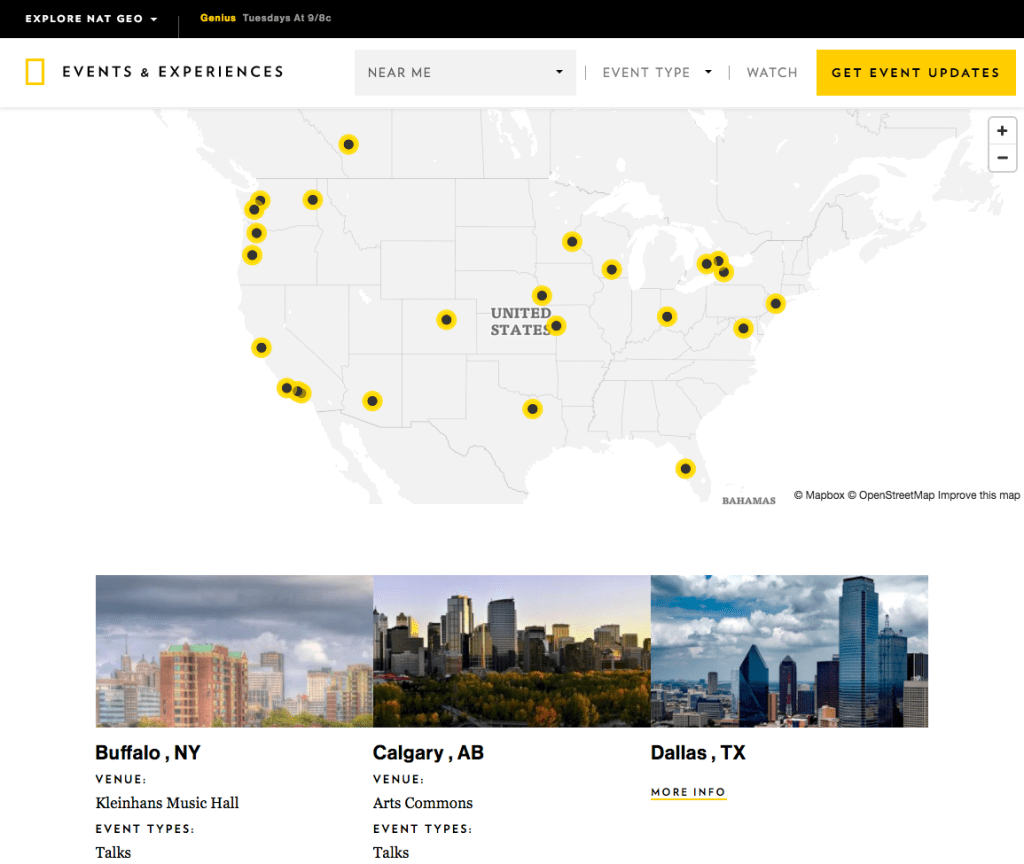 Working with our National Geographic Live team we built a map that helps populate the growing reach of the speaker series. Using the new Mapbox GL Javascript library along with a lightly designed multi-scale basemap. You can view it live here – https://events.nationalgeographic.com/locations/city/all